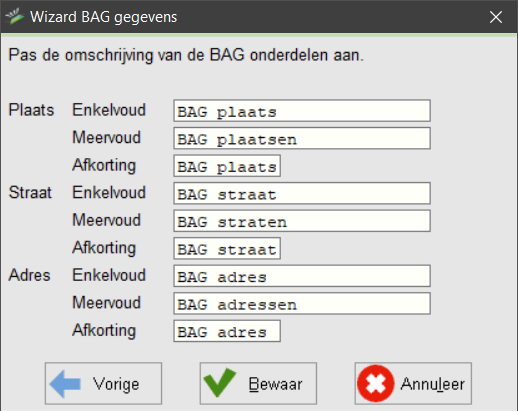 Door op [Volgende] te klikken gaat u door naar het tweede scherm, waar u eventueel de naamgeving van de geselecteerde BAG-gegevens kunt aanpassen. Door op [Vorige] te klikken kunt u terug naar het eerste wizard-scherm.