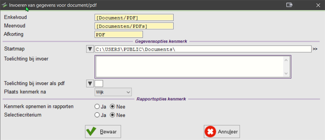 Ook is het mogelijk om een pdf met uitleg toe te voegen. De pdf moet wel eerst aangeleverd worden, inclusief vermelding welke dataset en kenmerk waaraan ze gekoppeld moeten worden. Voordelen van pdf zijn toelichting met foto's en bijvoorbeeld dat de toelichting geopend kan blijven tijdens het invoeren (dit is met de teksttoelichtingen niet mogelijk).