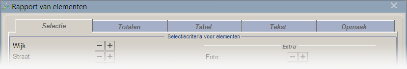 Op de tabbladen Totalen, Tabel en Tekst bepaalt u welke kenmerken u in het rapport wilt tonen.