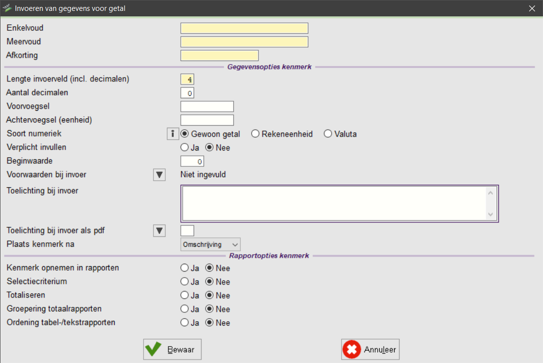 Het kenmerktype getal voegt een numerieke kenmerk toe aan een invoerscherm. Voorbeelden van numerieke kenmerken zijn: prijs, aantal, of lengte. Wanneer u een tijdstip met het kenmerk wilt aangeven, dan kunt u beter kiezen voor het kenmerktype Jaartal of Datum.