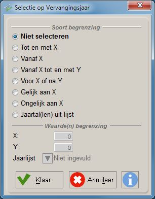 Wanneer u de begrenzingsoptie Jaartal(len) uit lijst kiest, vinkt u bij jaarlijst de jaartallen aan die u als selectiecriterium wilt mee nemen. Met de