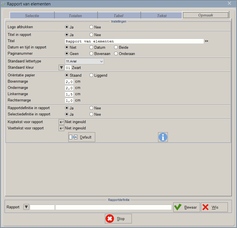 Hier kunt u de instellingen van het rapport opslaan. De rapportdefinitie omhelst alle instellingen op de tabbladen Totalen, Tabel, Tekst en Opmaak. De Selectie slaat u op in een Selectiedefinitie.