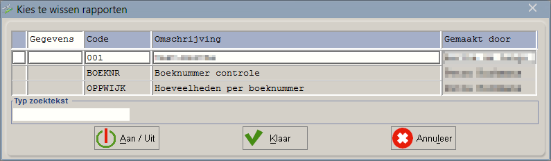 Met de [Aan/uit]-knop selecteert u alle rapportdefinities. Klikt u op [Klaar], dan worden alle regels gewist.