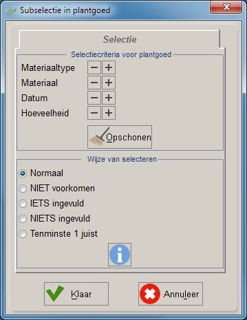 Door op de [Klaar]-knop te klikken maakt u de selectie definitie. De beheermodule doorzoekt vervolgens de gegevensset. Klik op [Annuleer] om het menu te verlaten zonder de selectiecriteria toe te voegen aan de selectie.