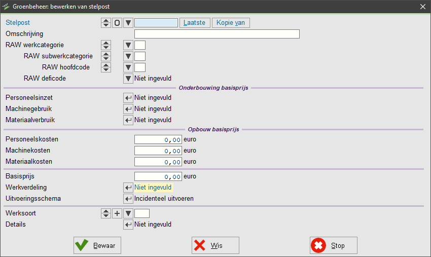 3) U voert in hoeveel uren u aan personeel, machines en materiaal nodig heeft voor de stelpost. Het totaal aantal uren, vermenigvuldigd met de uurprijs per post vormt de basisprijs van de werkzaamheid.