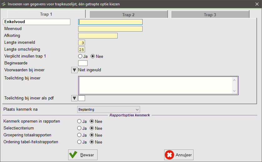 Een trapkeuzelijst bestaat uit minimaal twee trappen. Bij iedere trap moet u in ieder geval de bovenste velden Enkelvoud, Meervoud en Afkorting invullen. De afkorting bepaalt hoe het kenmerk verschijnt in het overzicht van kenmerktypen, wat u invult bij enkelvoud hoe het kenmerk verschijnt in het invoerscherm.