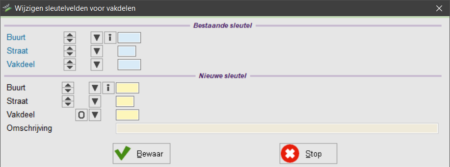 Onder Bestaande sleutel vult u de sleutelcode in die u wilt wijzigen. Onder Nieuwe sleutel verschijnt dan bij "Omschrijving" ter controle het vakdeel dat u geselecteerd heeft. Vervolgens vult u een nieuwe code in.